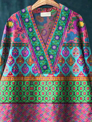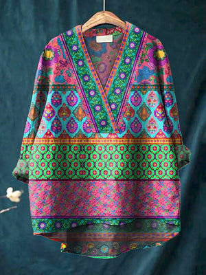 Ethnical Style Summer Floral Pattern Printed Women's Casual Cotton And Linen V-neck Shirt