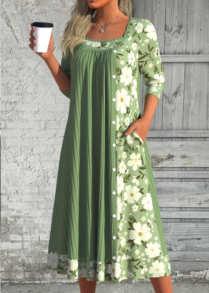 Green Patchwork Floral Print Long Sleeve Scoop Neck Dress