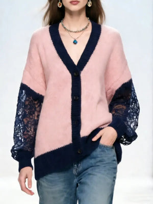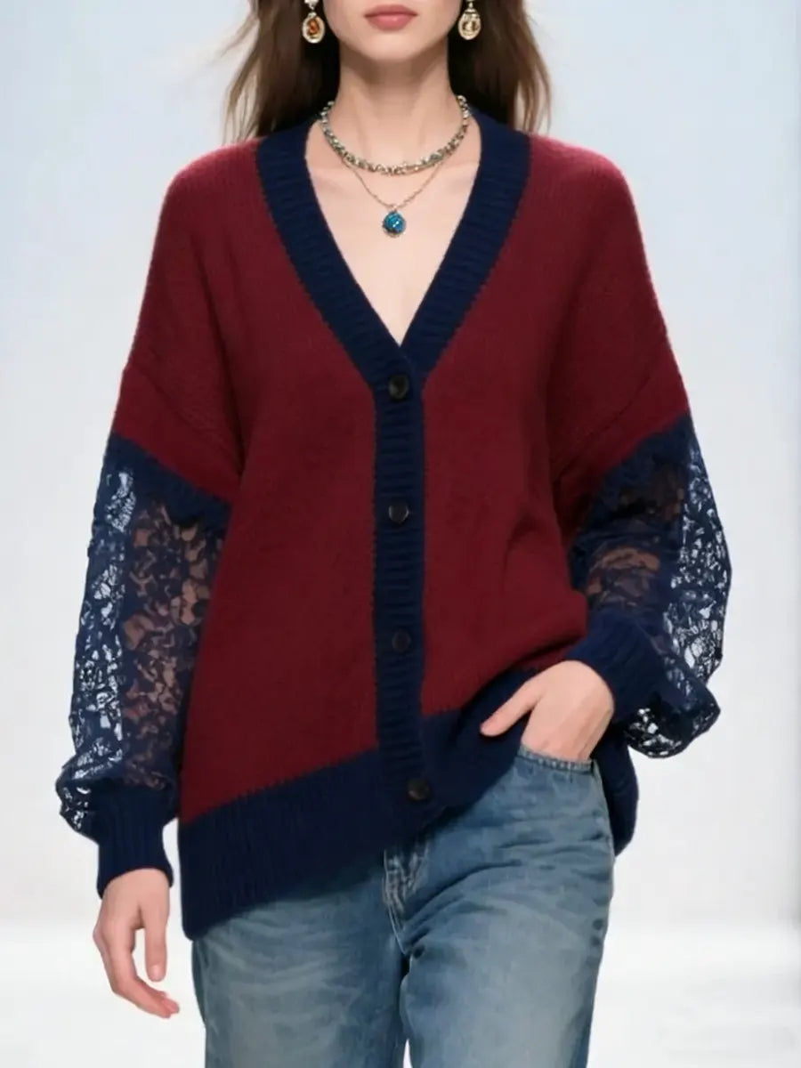 Women's Color-block Lace-paneled V-neck Long-sleeved Casual Loose-fitting Knitted Cardigan