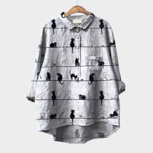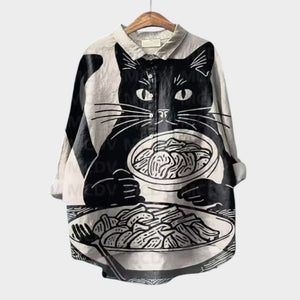 Cute Cat Print Button Front Shirt, Casual Lapel Long Sleeve Shirt, Women's Clothing