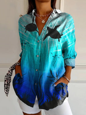 Sea Turtle And Sea Cavern Art Printed Women's Casual Cotton Shirt