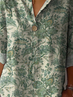 Vintage Style Green Garden Pattern Printed Women's Casual Cotton Linen Shirt