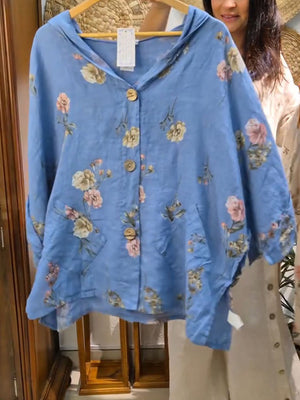 Women's Floral V-Neck 3/4 Sleeve Casual Cotton and Linen Hooded Shirt