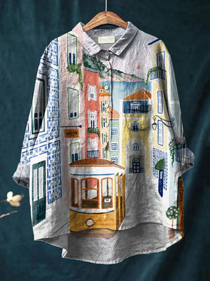 Women's Vintage Hand Drawn Beautiful Street Scenes Print Casual Cotton And Linen Shirt