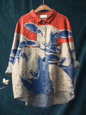 Women's Vintage Hand-Painted Lambs Print Casual Cotton And Linen Shirt