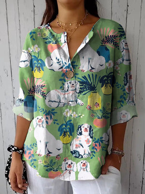 Women's Vintage Lovely Dogs Art Print Casual Cotton Linen Shirt