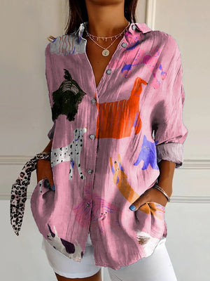 Women's Vintage Lovely Dogs Art Print Casual Cotton Shirt