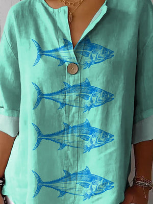 Women's Vintage Lovely Fish Art Print Casual Cotton Linen Shirt
