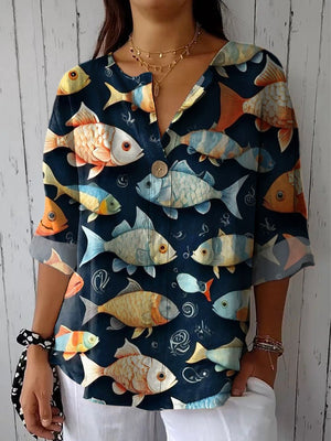 Women's Vintage Lovely Fish Art Print Casual Cotton Linen Shirt