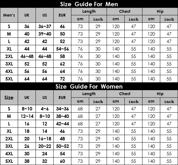 S, M, L, XL, 2XL, 3XL, 4XL, 5XL |