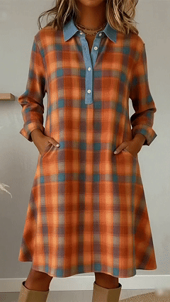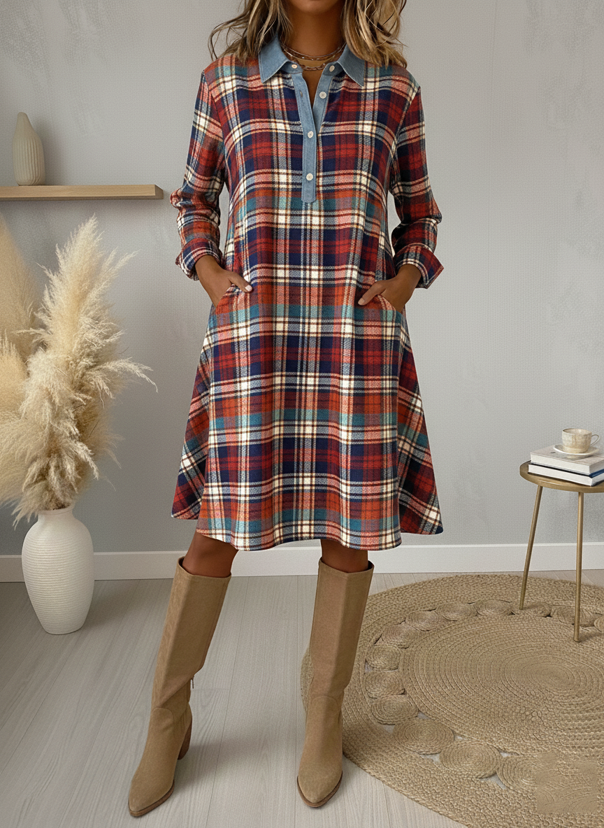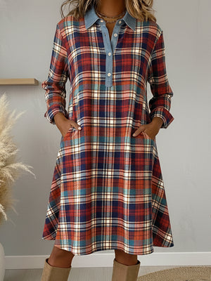 Retro Casual Denim Patchwork Plaid Print A-line Dress