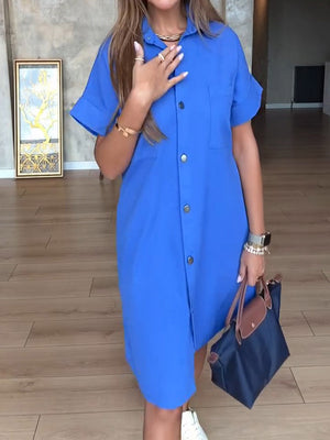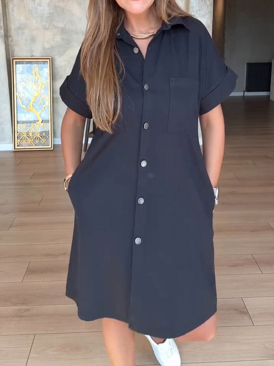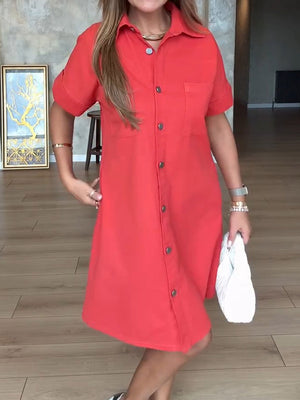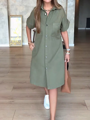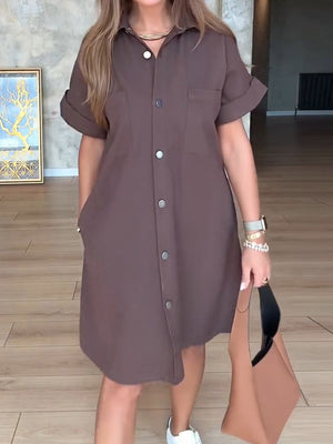 Women's Lapel Short Sleeve Solid Color Casual Cotton Shirt Dress