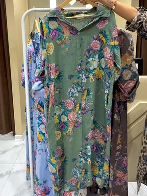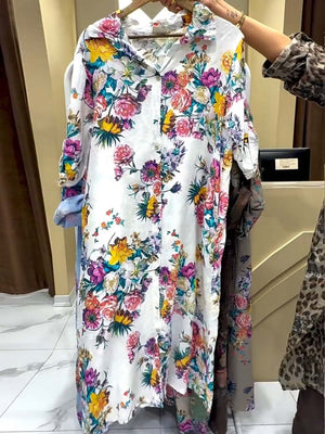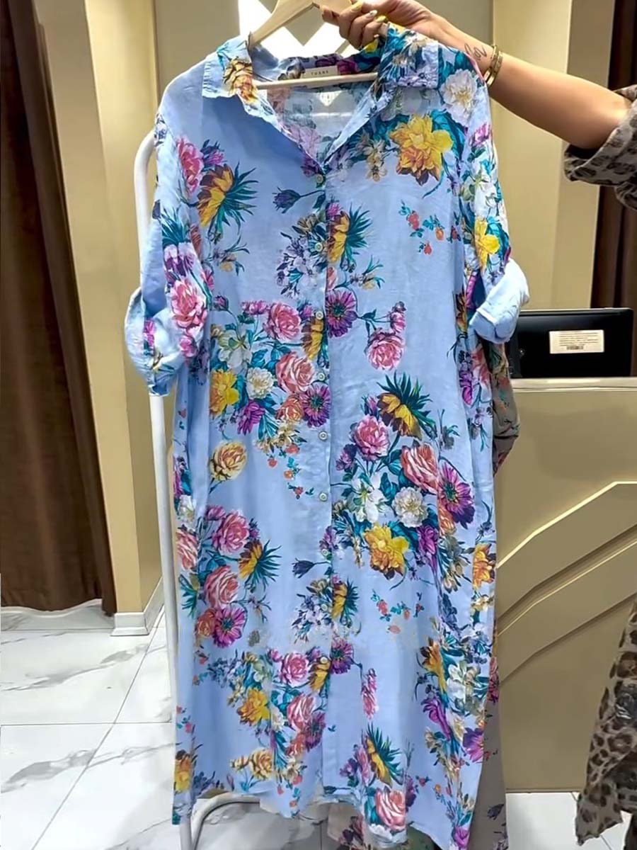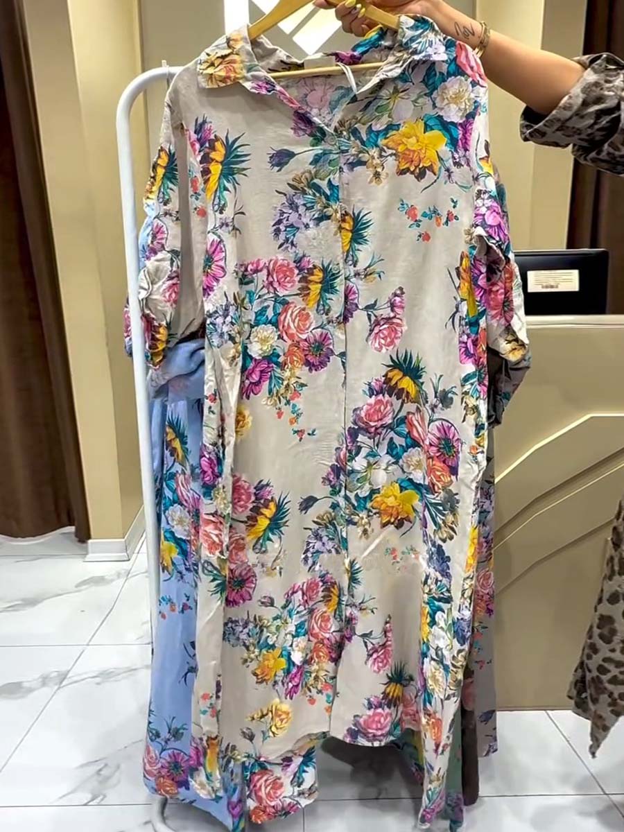 Women's Shirt Collar 3/4 Sleeves Vintage Print Casual Pocket Cotton and Linen Shirt Dress