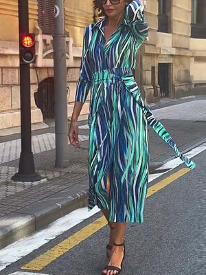 Women's Shirt Collar Long Sleeve Abstract Geometric Print Waisted Hip Dress