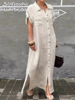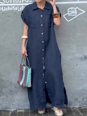 Women's Solid Color Lapel Short Sleeve Casual Cotton and Linen Long Shirt Dress
