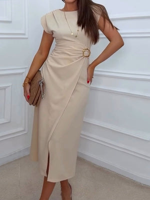 Women's Solid Color Round Neck Short Sleeve Pleated Fitted Dress