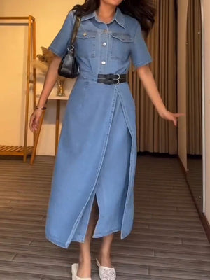 Women's Solid Color Shirt Collar Short Sleeve Loose A-Line Denim Dress