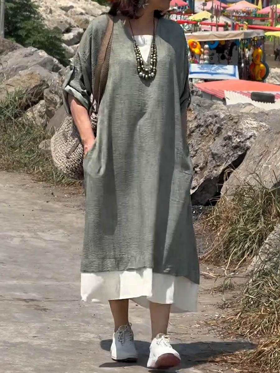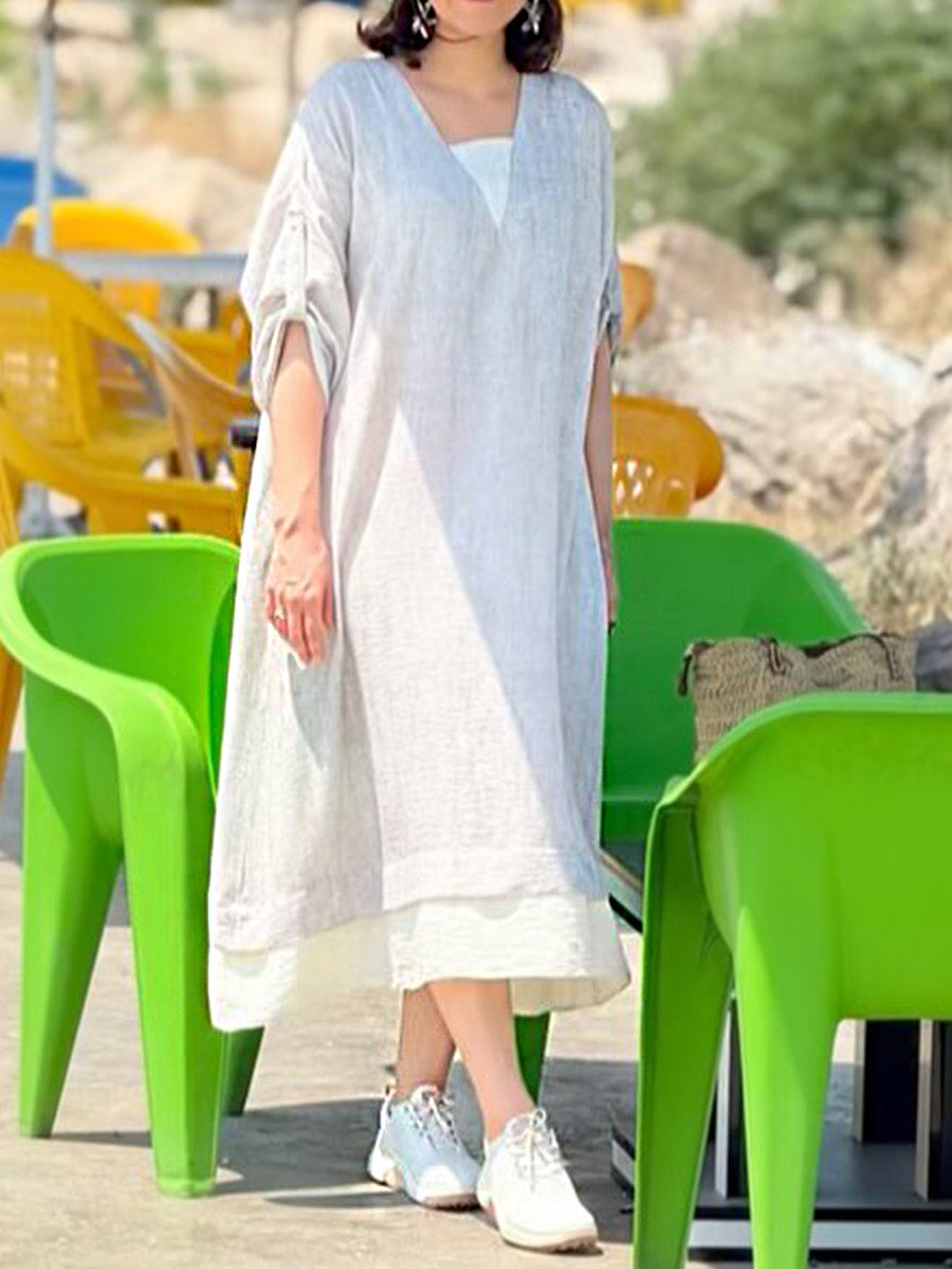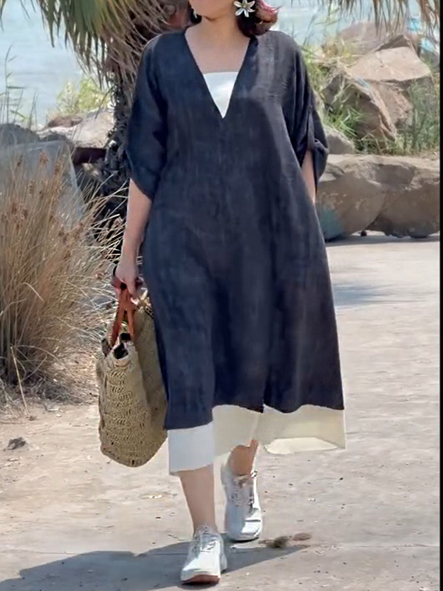 Home Dress Women's Solid Color V-Neck 3/4 Sleeve Casual Loose Contrast Color Stitching Fake Two-Piece Cotton and Linen Dress