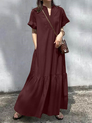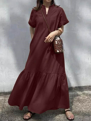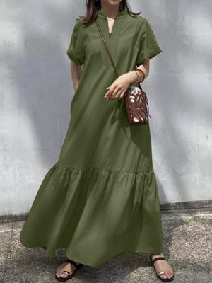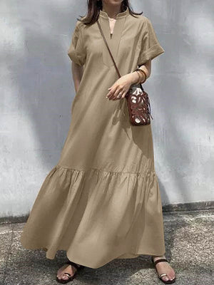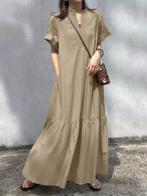 Women's Stand Collar Short Sleeve Loose A-Line Stylish Solid Color Cotton Dress