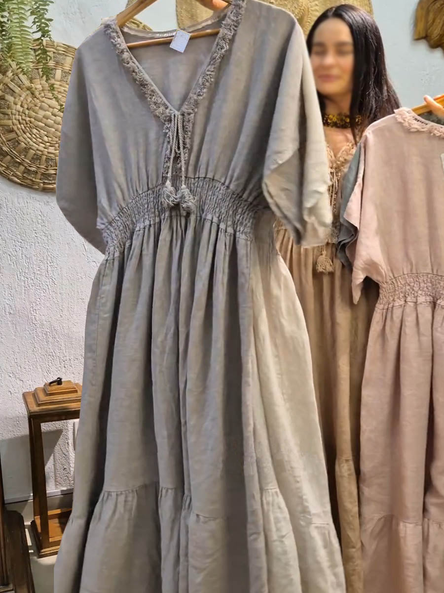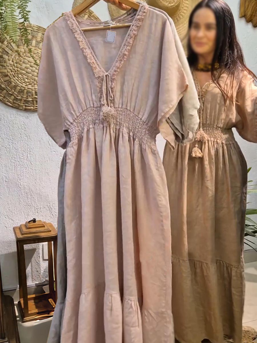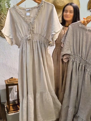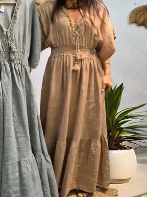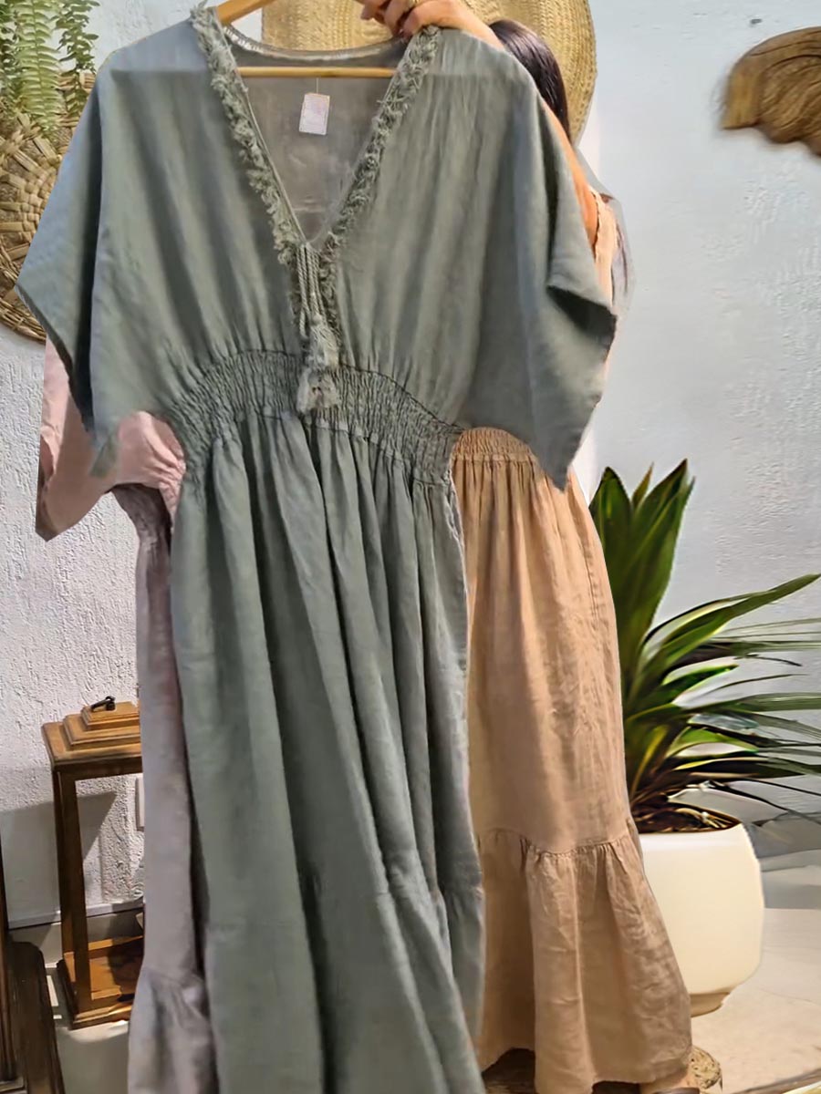 Women's V-neck Short Sleeve Elastic Waist Solid Color Casual Cotton and Linen Dress