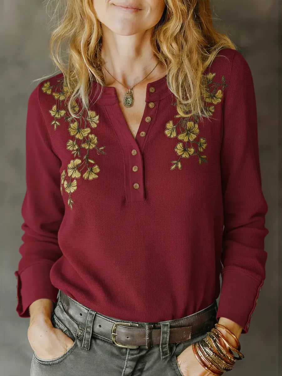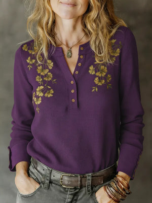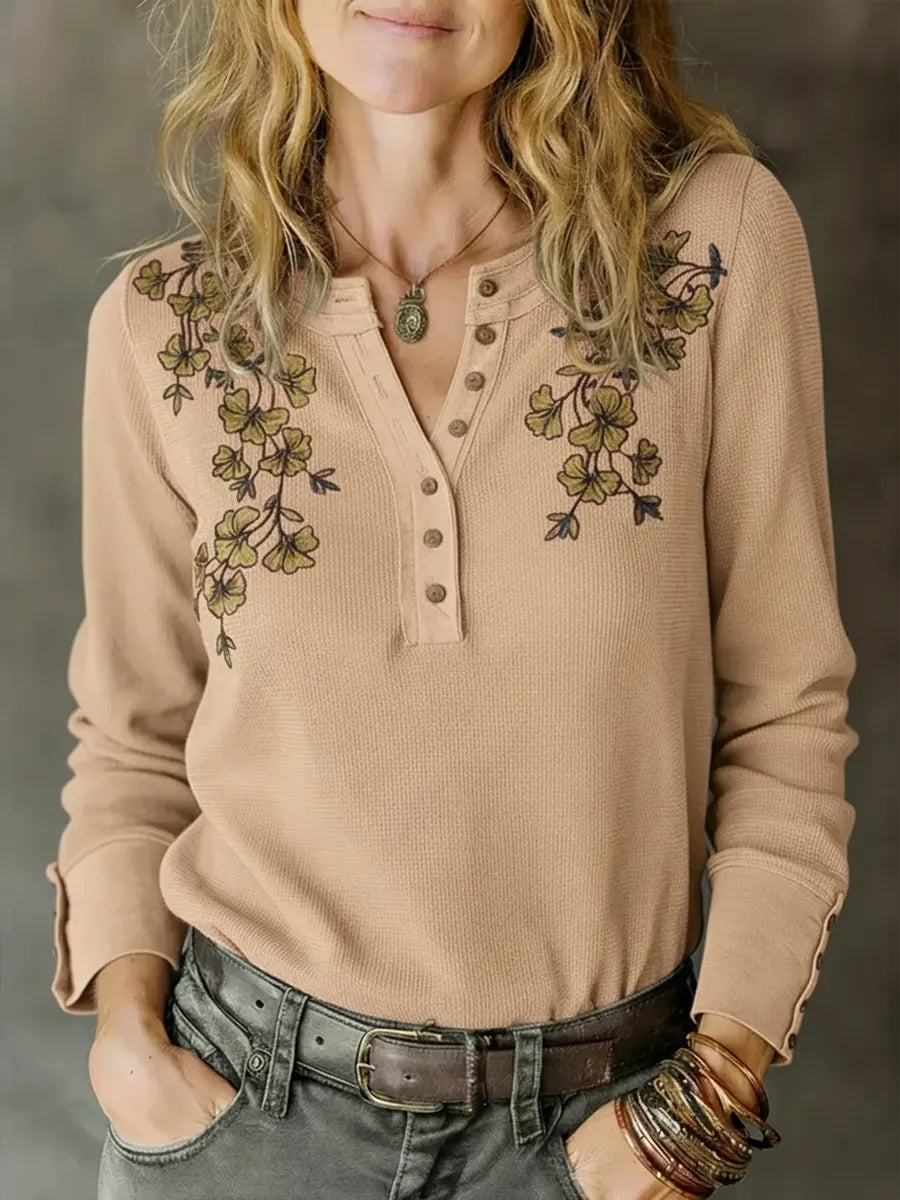 Women's Floral Print Waffle-knit Cotton Henley Top