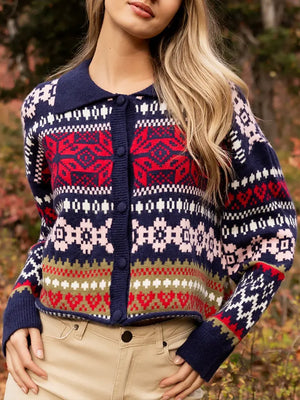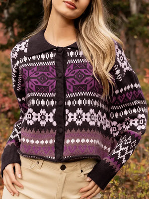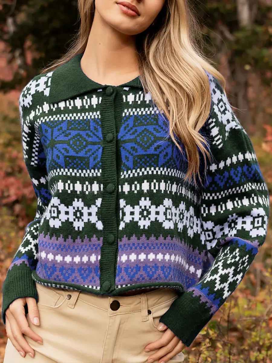 Women's Geometric Print Lapel Long-sleeved Casual Loose Knit Cardigan