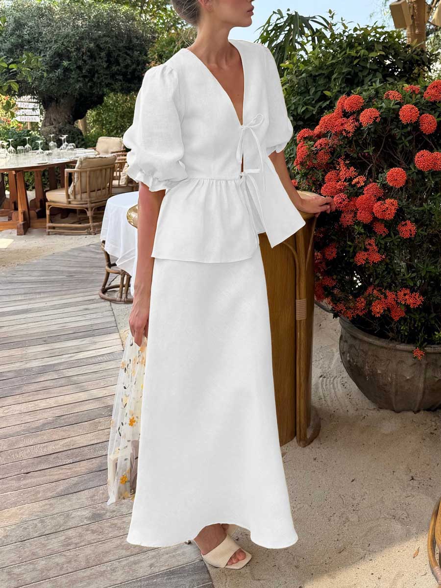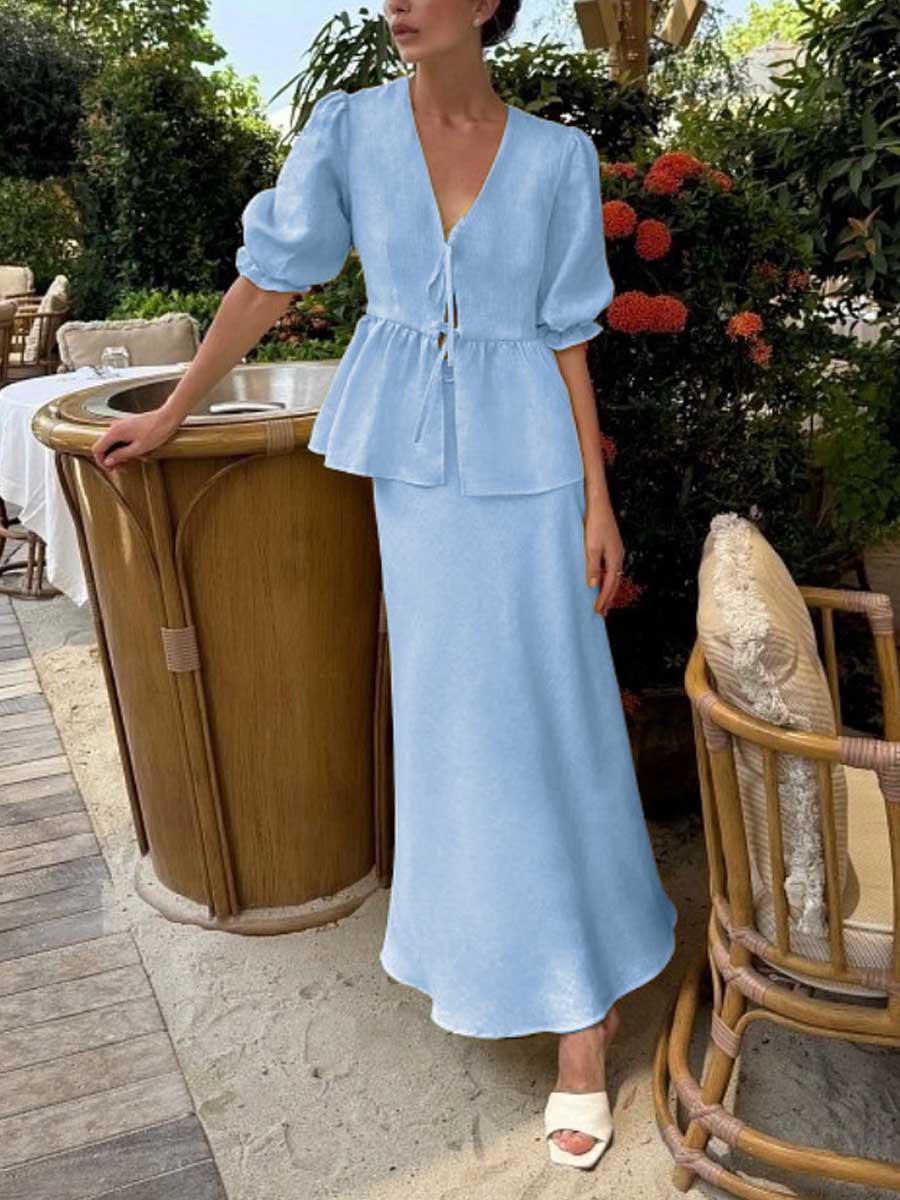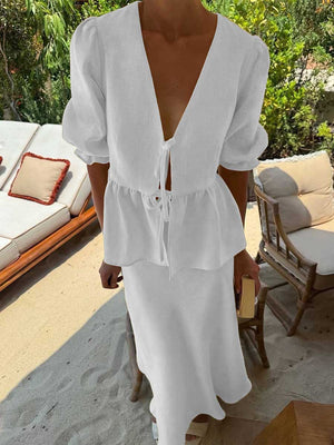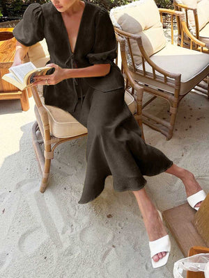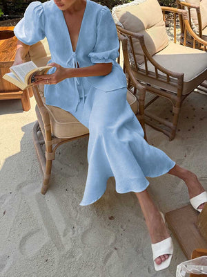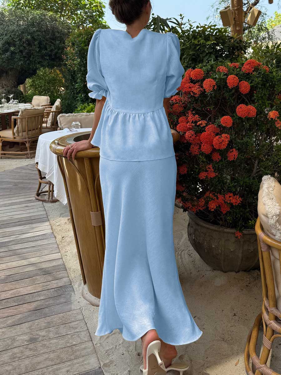 Women's Solid Color Casual Loose Stylish Cotton Ruffled Short Sleeve Top Skirt Set