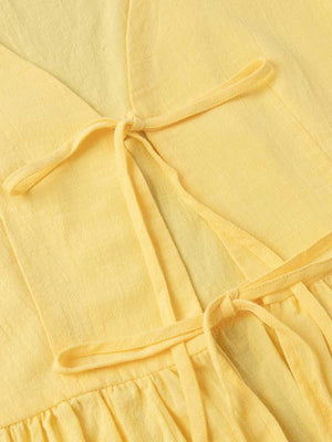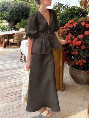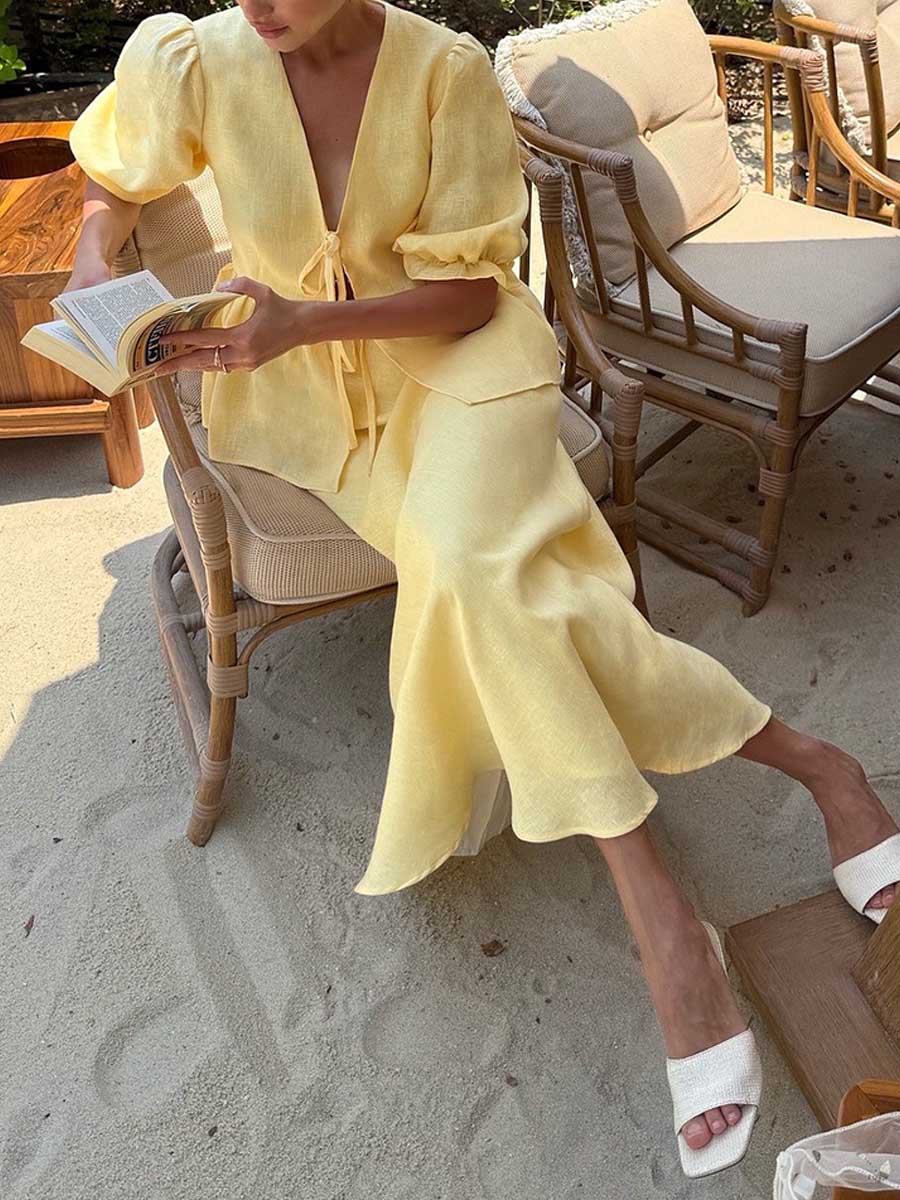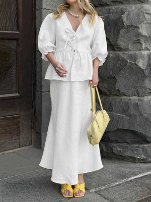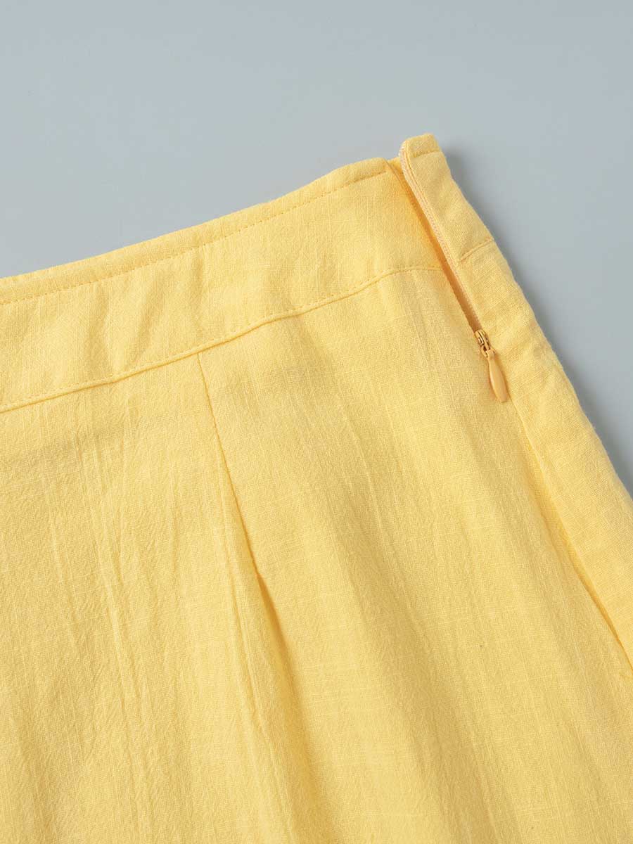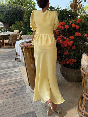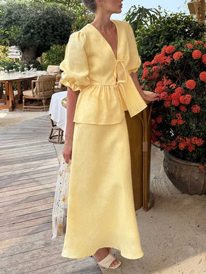 Women's Solid Color Casual Loose Stylish Cotton Ruffled Short Sleeve Top Skirt Set