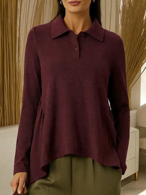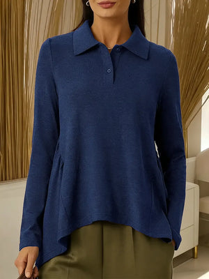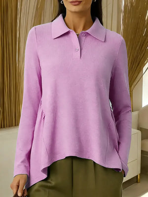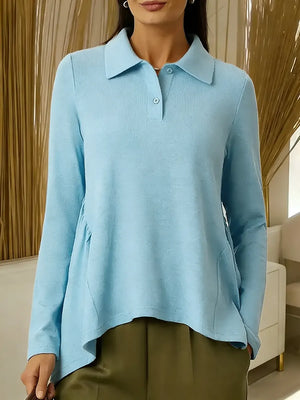 Women's Solid Color Shirt Collar Long-sleeved Casual Loose Top With Irregular Hem.