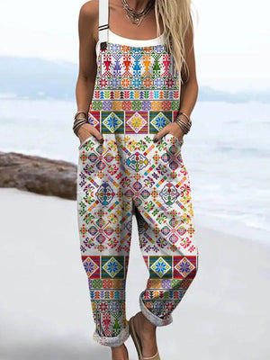 Women's Vintage Geometric Pattern Art Print Casual 100% Cotton Wide Leg Jumpsuit