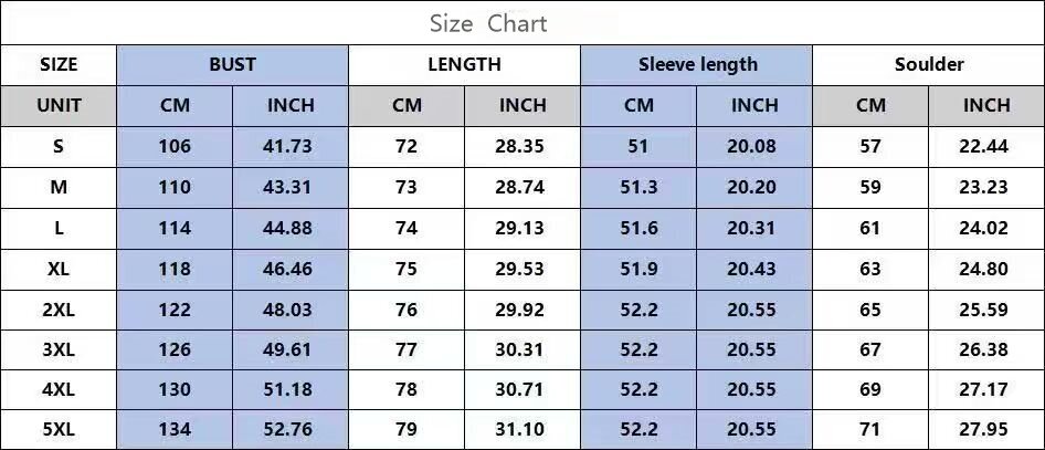 S, M, L, XL, 2XL, 3XL, 4XL, 5XL |
