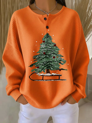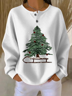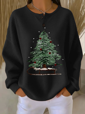 Women's Vintage Christmas Tree Art Print Casual Waffle Henry Collar Sweatshirt