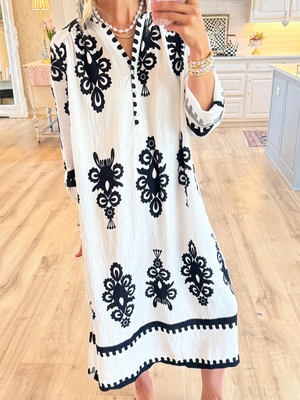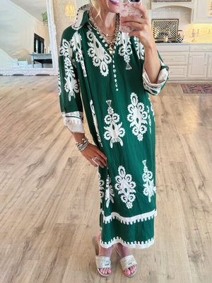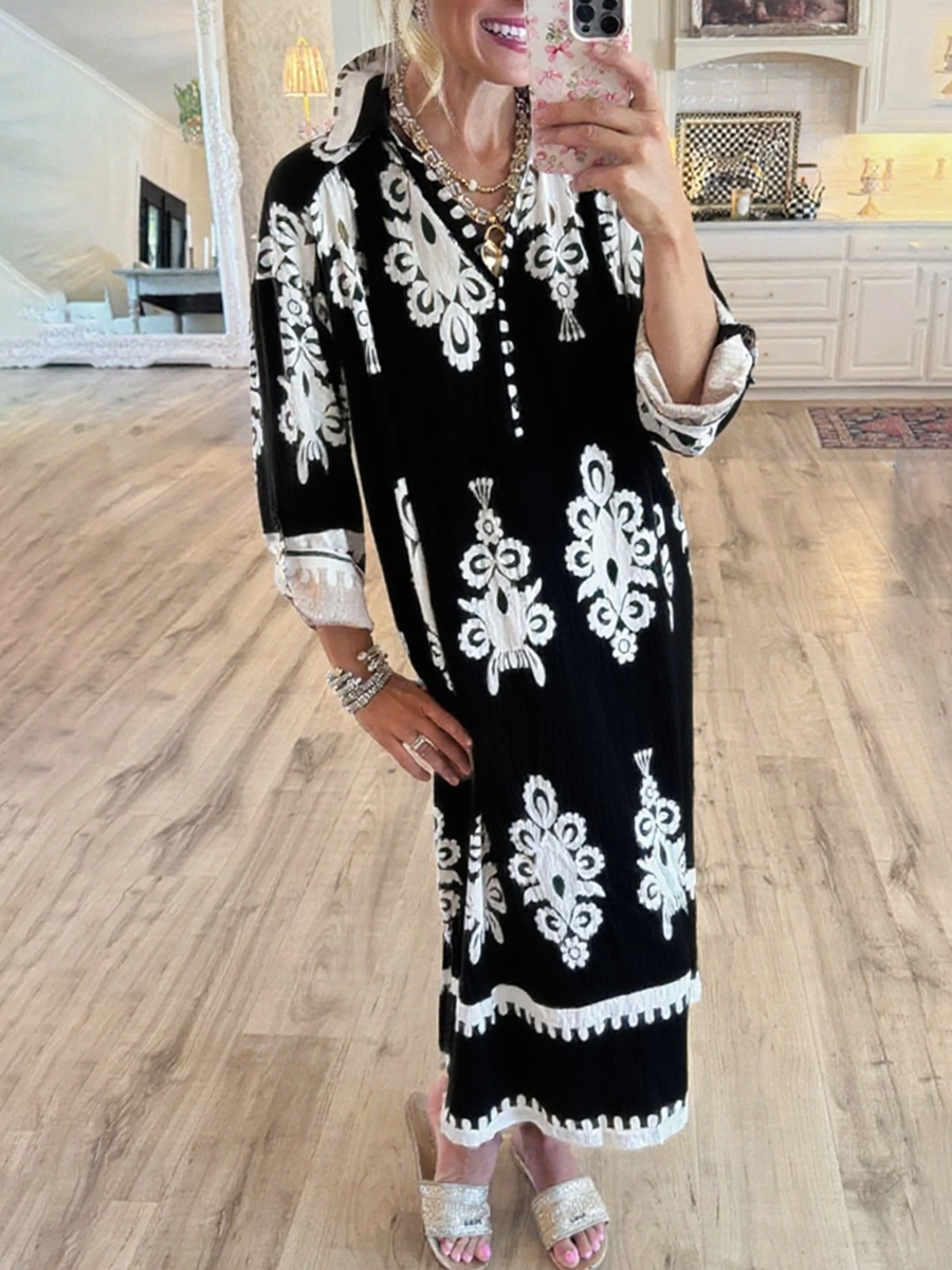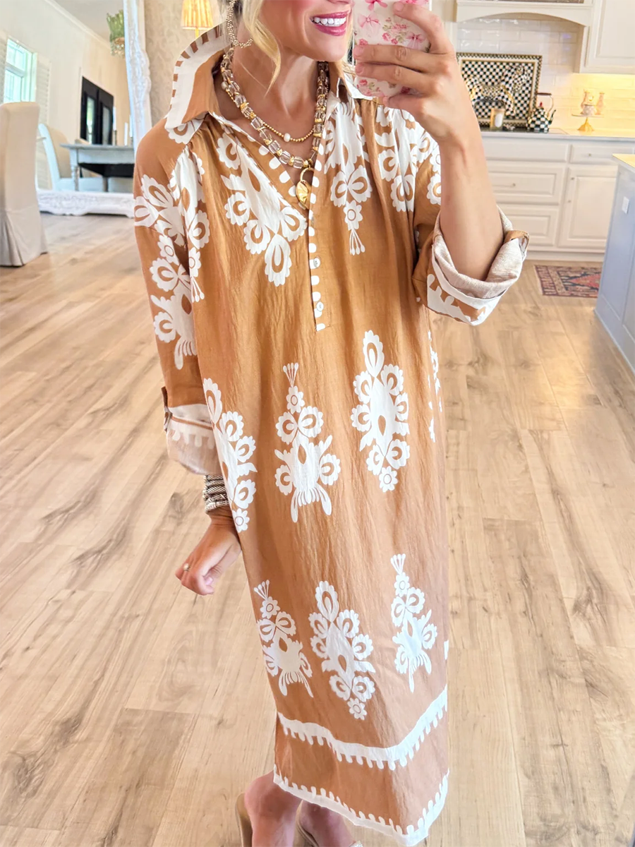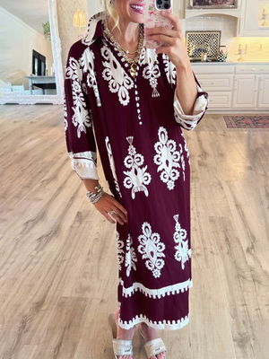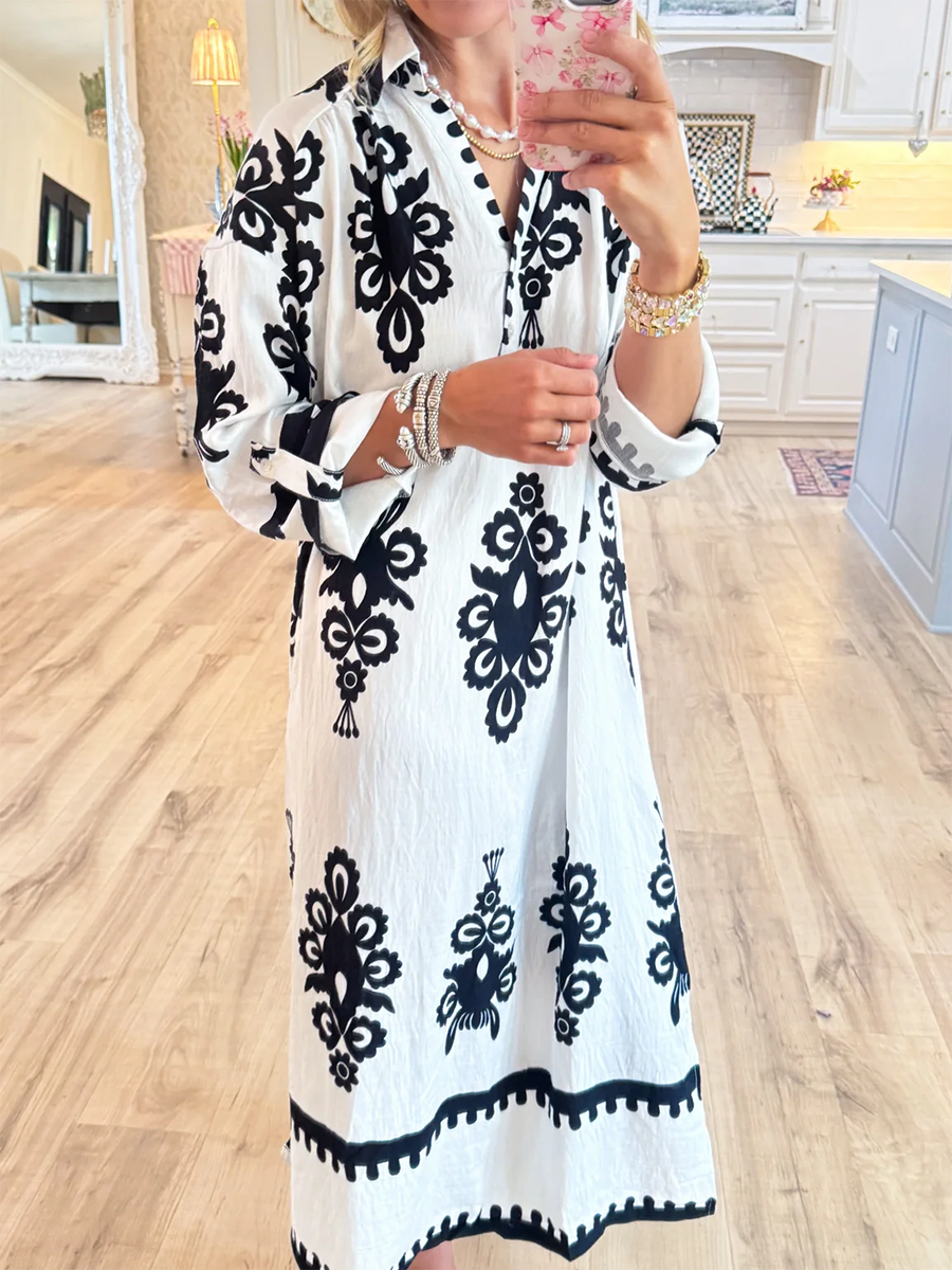Women's Loose V-neck Long-sleeved Cotton and Linen Dress