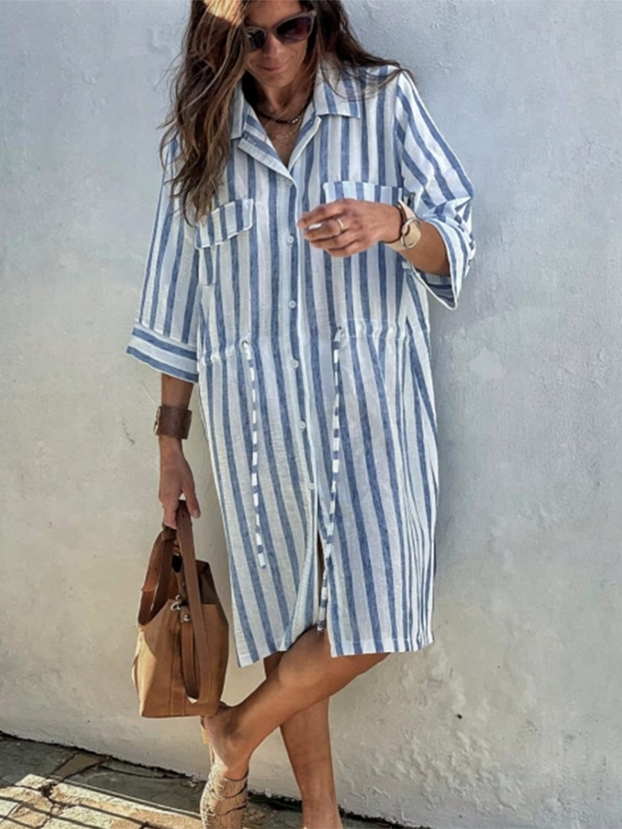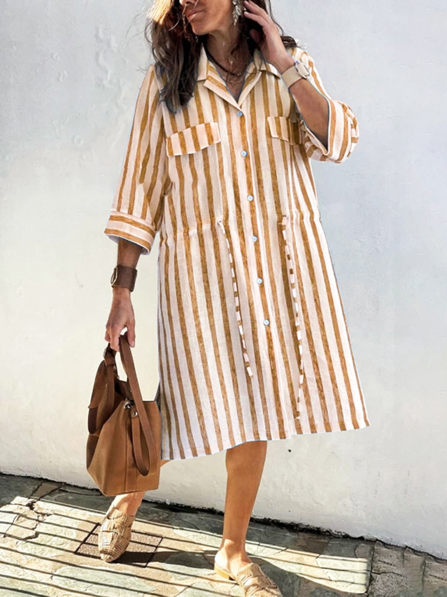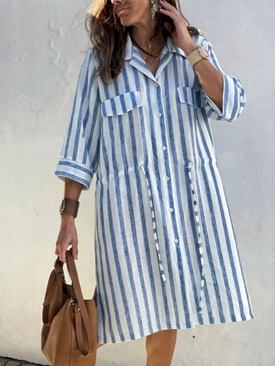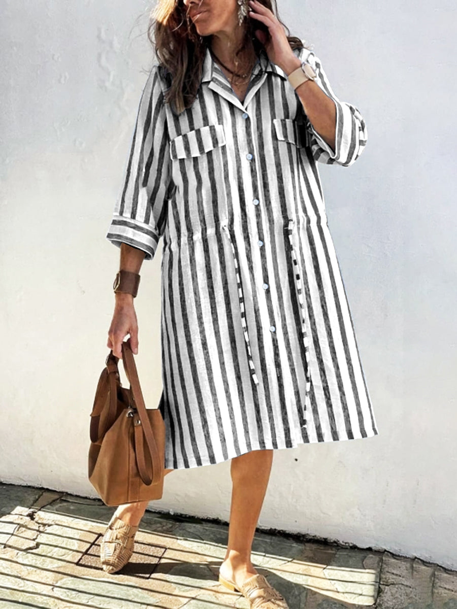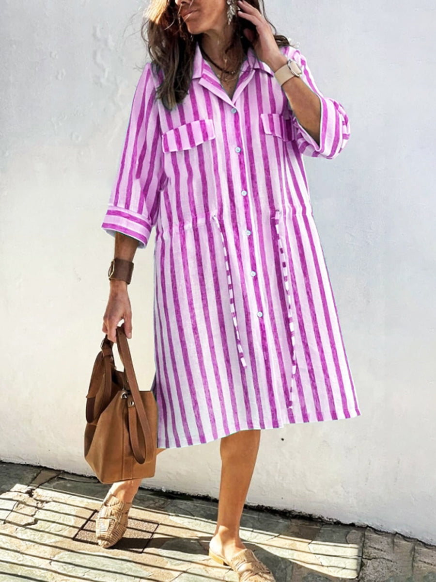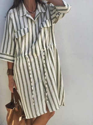 Women's Striped Print Drawstring Waist Linen Dress