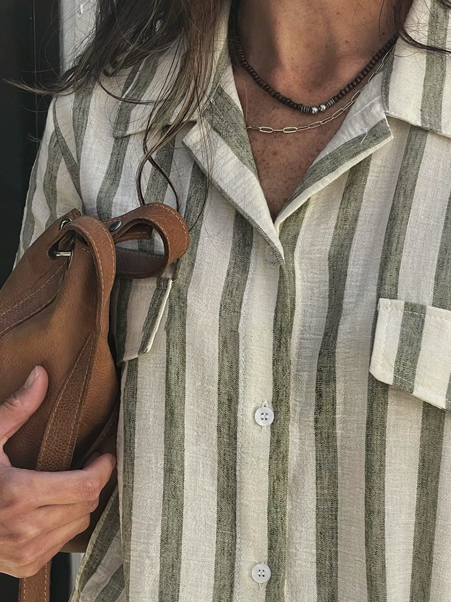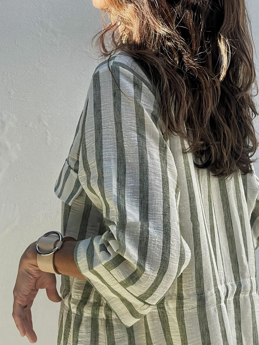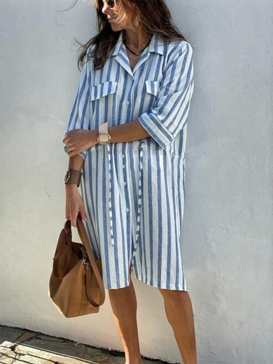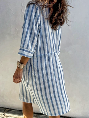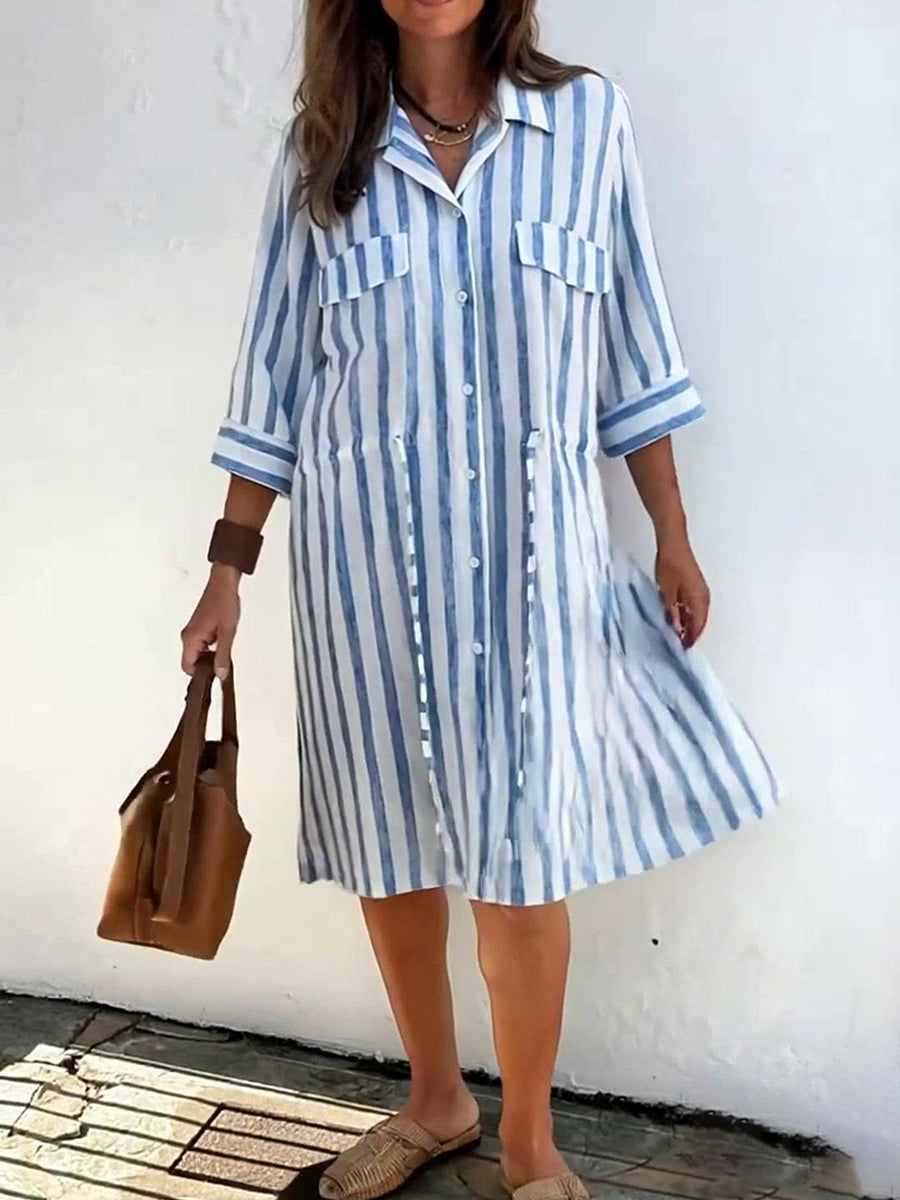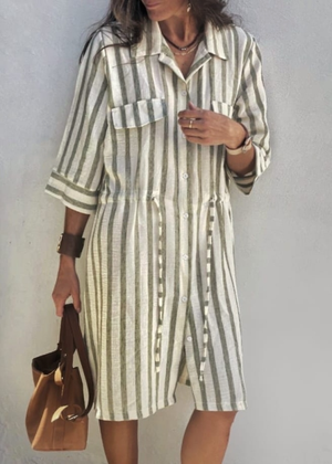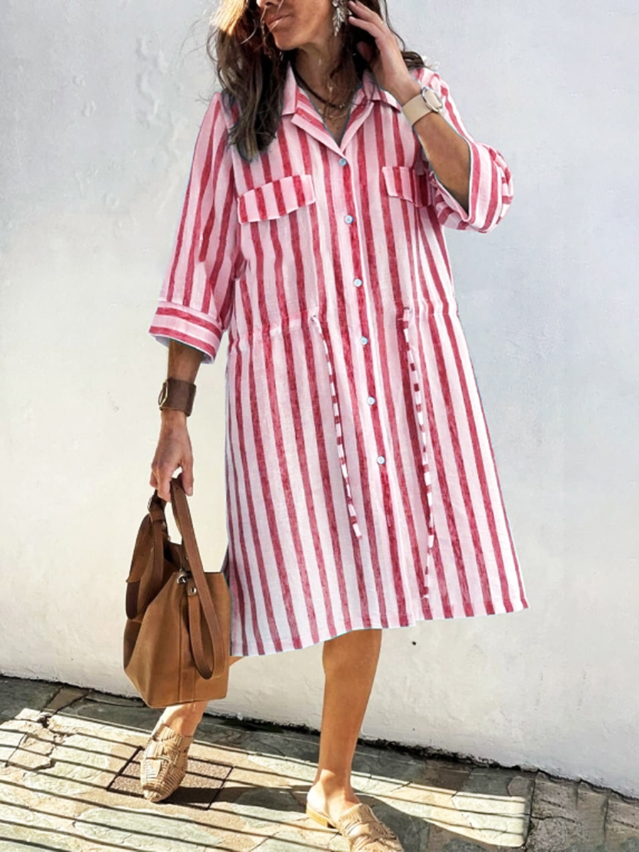 Women's Striped Print Drawstring Waist Linen Dress