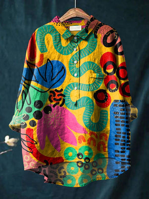Abstrct Art Printed Women's Casual Cotton And Linen Shirt