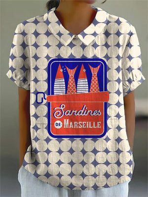 Can Sardine Fish Pattern Printed Women's Casual Cotton And Linen Shirt
