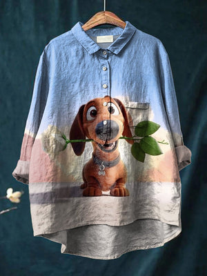 Cartoon Dachshund Dog Graphic Printed Women's Casual Cotton And Linen Shirt