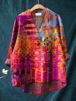 Colorful Geometric Pattern Printed Women's Casual Cotton And Linen V-neck Shirt