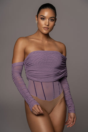 EXCLUSIVELY DESIGNED BY US FOR YOU. Crafted in a sheer mesh fabric, this elegant bodysuit showcases an asymmetrical neckline with exaggerated an off shoulder design, ruched arms and bust, and a stunning boning detail at the waist in a soft velvet fabric. The lower waist of this bodysuit is composed of a smooth doubled lined material for comfort. Complete with a thong bottom and double snap closure. Stretchy. Single lined.