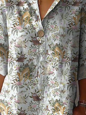 Woodland Animals And Floral Pattern Printed Women's Casual Cotton Linen Shirt