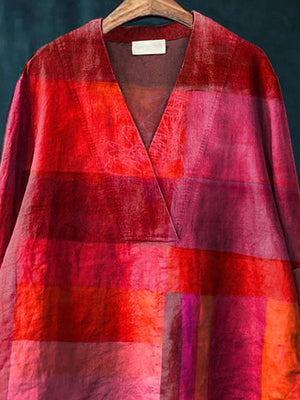 Oil Painting Geometric Color Block Art Printed Women's Casual Cotton And Linen V-neck Shirt