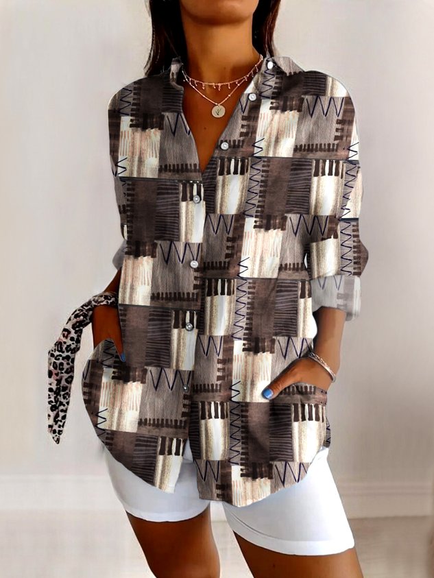 V Neck Long Sleeve Geometric Regular Micro-Elasticity Regular Fit Shirt For Women