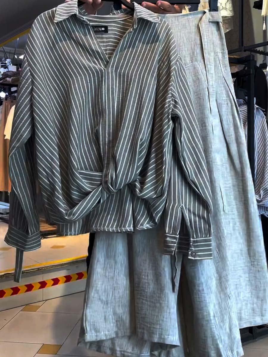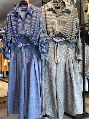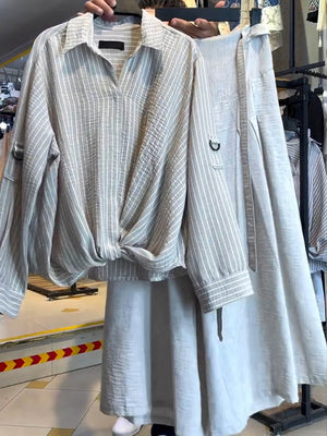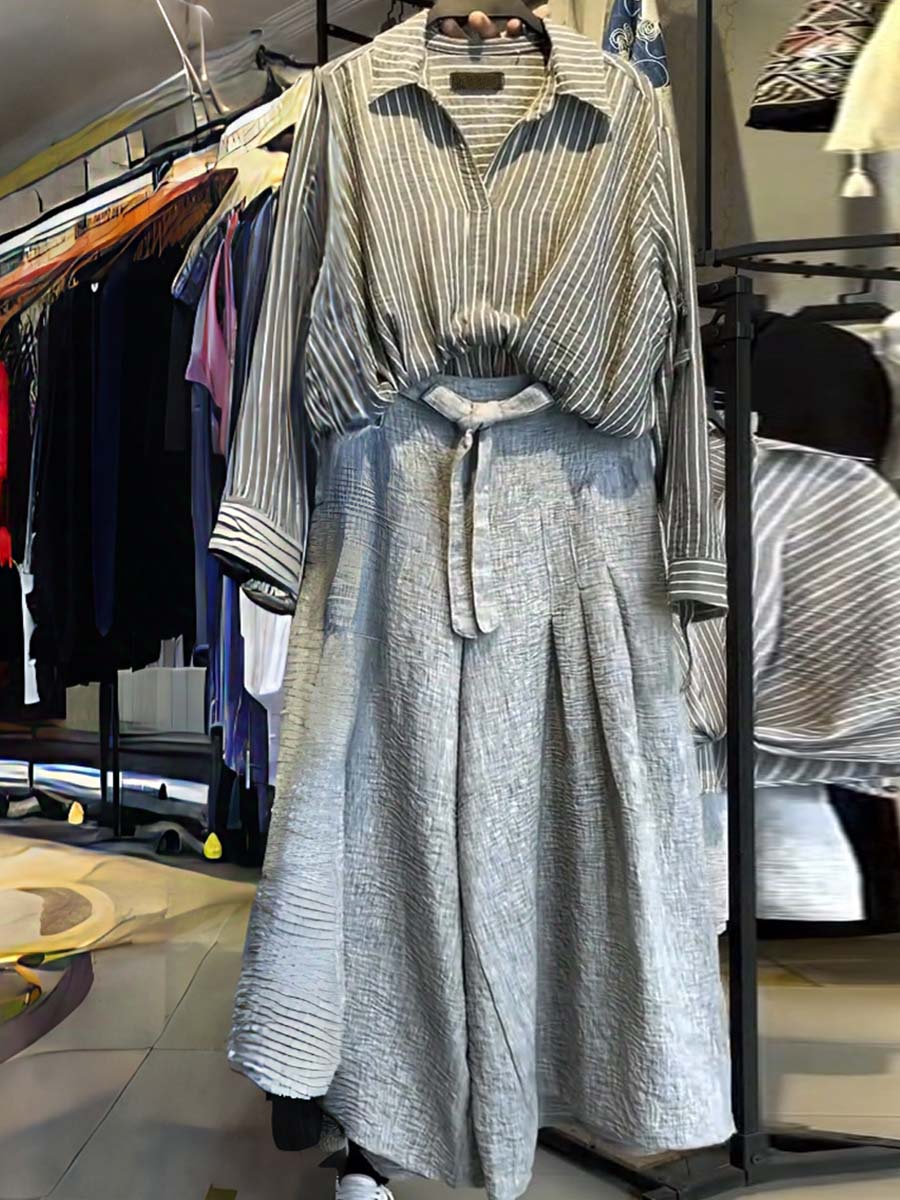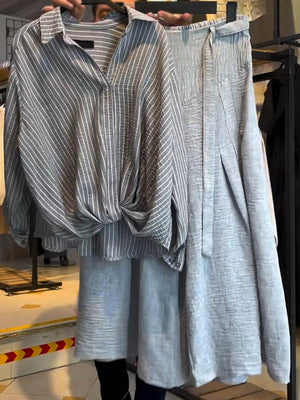 Women's Lapel Striped Print Long-Sleeved Shirt and High-Waisted Tie-Back A-Line Casual Cotton and Linen Skirt Set