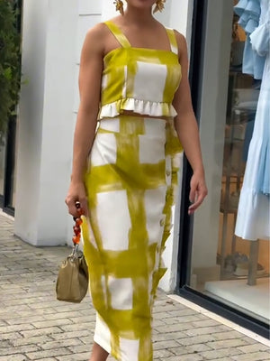 Women's Brushstroke Print Sleeveless Top and Ruffled Skirt Two-Piece Set