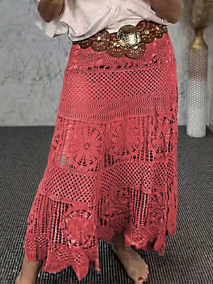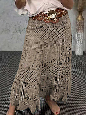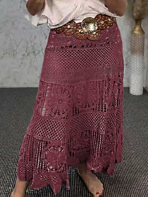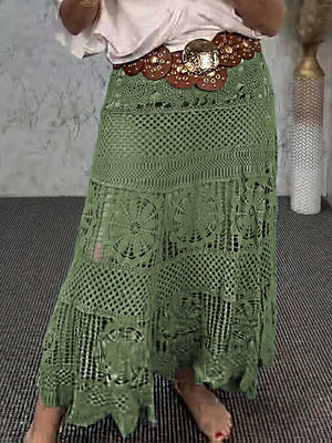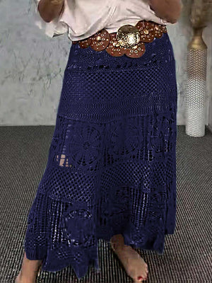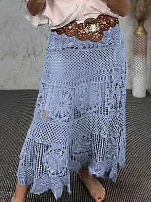 Women's High-Waisted Solid Color Hollow Lace Embroidery Casual A-Line Skirt