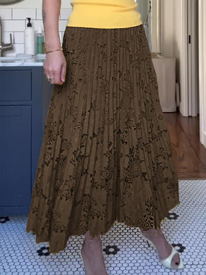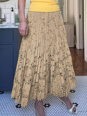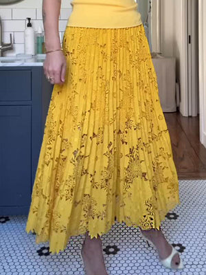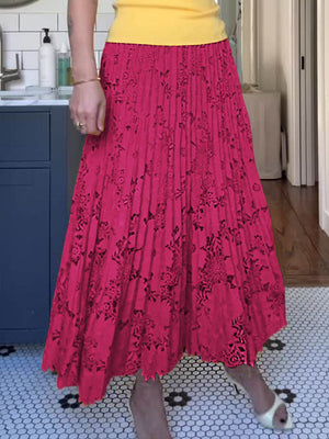 Women's Solid Color Elastic Waist Pleated Lace Embroidery A-Line Skirt