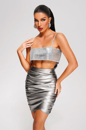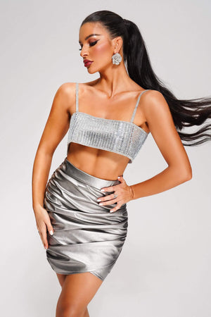 We totally know how to stop a party and let jaws hit the floor with Waga Crystallised Top! Shimmering rhinestone-encrusted metal fabric shapes a square neck, tank straps, and a sleeveless bodice that falls to a cropped hem. Turn around to show off a sexy open back with a adjustable extender chain.Cos your pants deserve a nice top, complete the look with it!