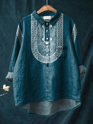 Ethnic Style Geometric Pattern Printed Women's Casual Cotton And Linen Shirt