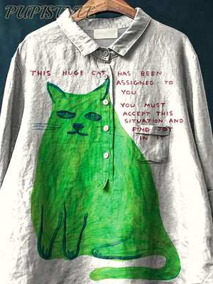 Funny Cat Joke Graphic Printed Women's Casual Cotton And Linen Shirt